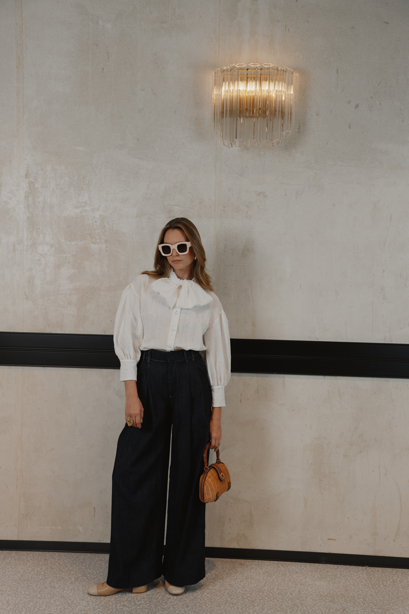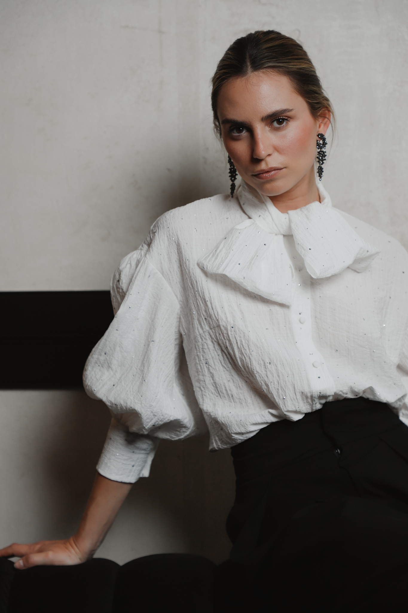 Camisa blanca en tejido texturizado con acabado arrugado y sutil fantasía glitter. De silueta versátil, presenta mangas abullonadas con botones forrados en el mismo tejido y una lazada en el cuello ya preformada para mayor comodidad.