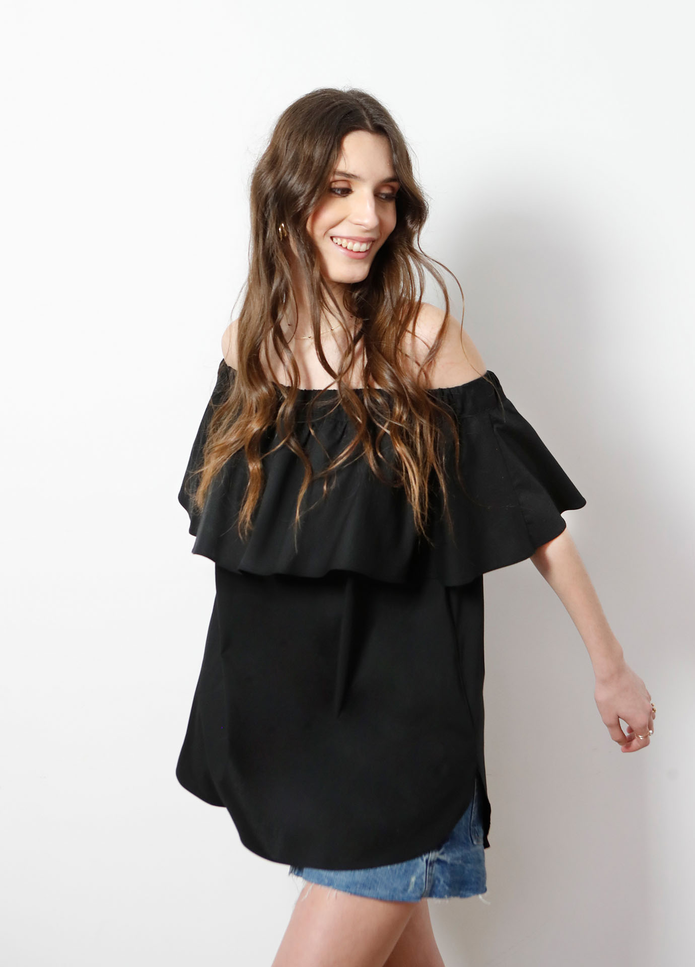• Escote en barca con gran volante rizado